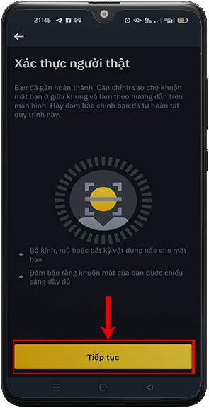 13、Ấn tiếp tục để xác thực khuôn mặt trên binance
